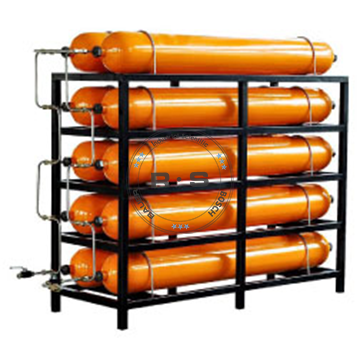 高压储气系统包含 6个容积为 50L,使用压力为 40Mpa钢瓶,钢瓶压力表,钢瓶安全阀,钢瓶截止阀,钢瓶支架等。同时配有钢瓶压力监视开关,一旦钢瓶内空气压力在存储过程中出现压力不足,及时发出声光报警,提示操作人员及时检查并补充空气,防止在紧急状况时没有足够的空气进行充瓶。所有的高压钢瓶均为符合中国压力容器标准,并带有检验报告的产品。